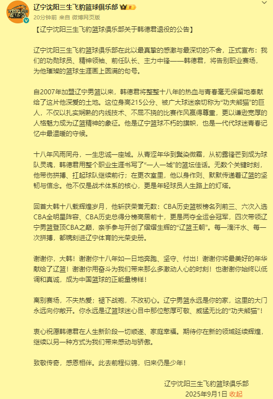 北京时间9月1日下午5点55,辽篮正式官宣功勋老队长韩德君退役,结束他在辽篮长达18个赛季的职业生涯,至此,可以正式和大韩说再见了!