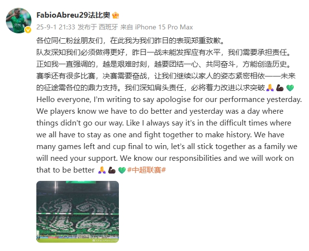 9月1日,北京国安外援法比奥通过社交媒体,就球队0-6不敌山东泰山的比赛向球迷致歉。