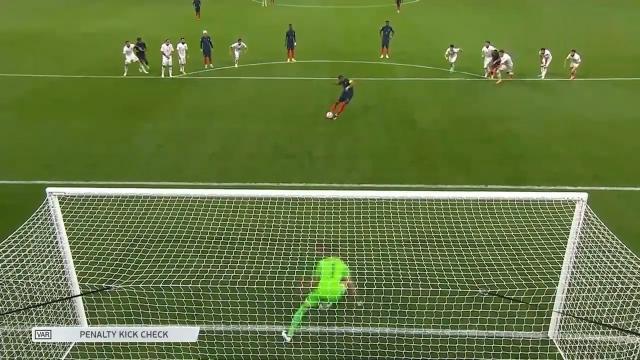 姆巴佩第一次主罚点球打左侧被门将弗拉霍迪莫斯扑出,但回放显示姆巴佩射门时弗拉霍迪莫斯提前移动,重罚,姆巴佩打相反方向破门。