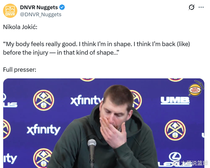 好在约基奇状态明显正在回暖,赛后约基奇表示自己的身体感觉非常好,正在恢复到受伤前的那种状态。