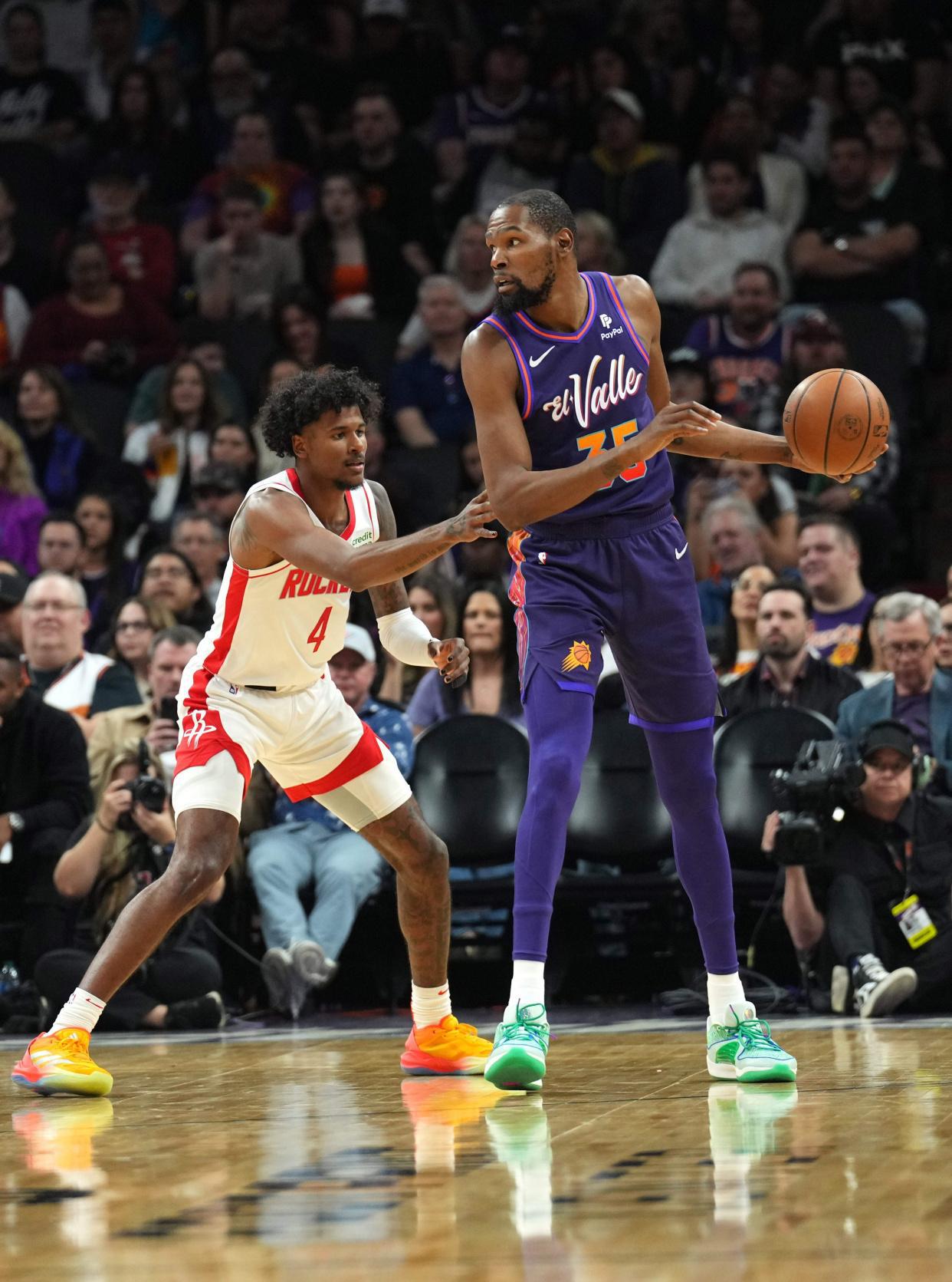 如果杰伦·格林和小史密斯被打包送走,火箭队必然会换来一位全明星级别的球员,比如说凯文·杜兰特。火箭队的随队记者杰克逊·加特林给出了一套交易方案,在他看来,火箭队如果想要得到超级前锋杜兰特的话,需要送出他们的外线核心杰伦·格林和内线核心小贾巴里·史密斯。另外,火箭队不需要送出今年的首轮10号签,他们需要送出2027年太阳队的首轮签——这个首轮签在去年的交易当中被换到了火箭队手里。